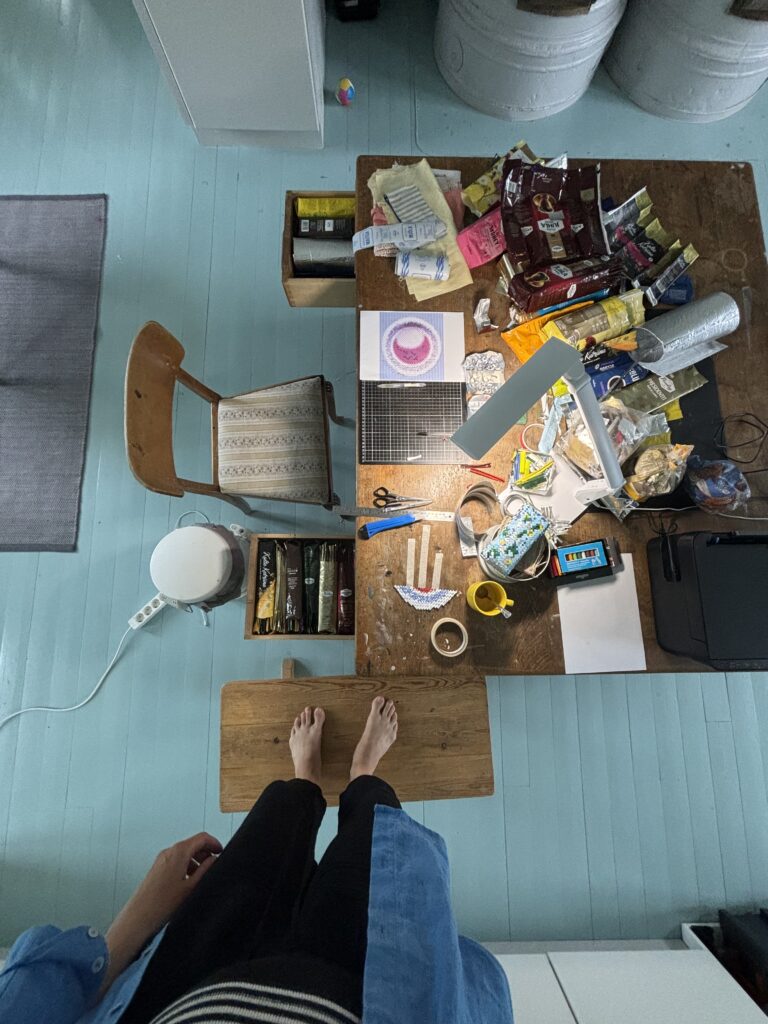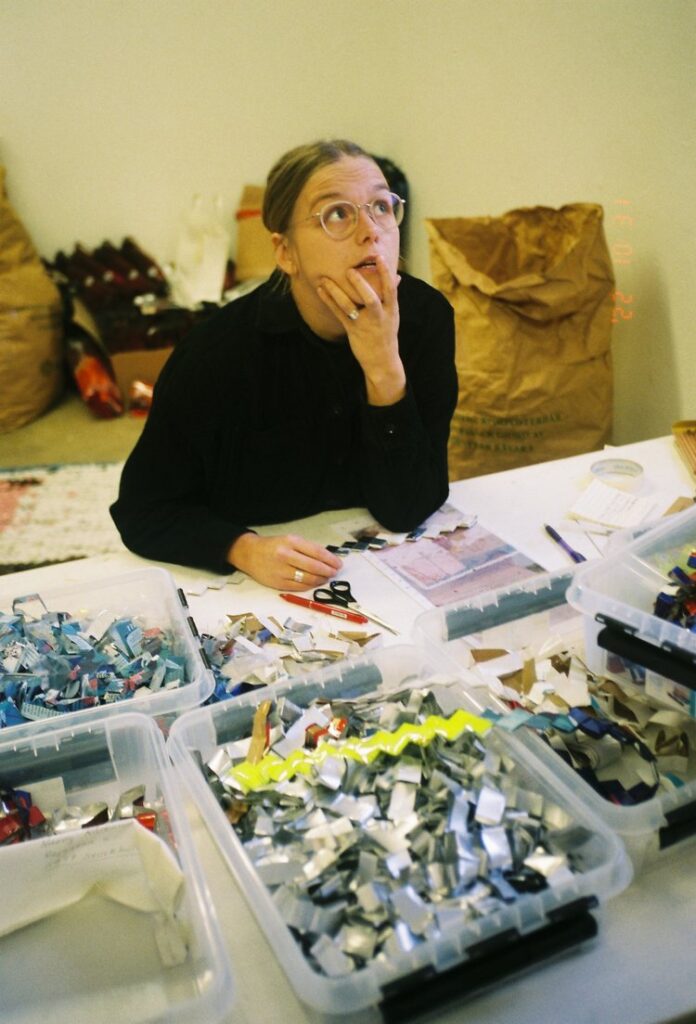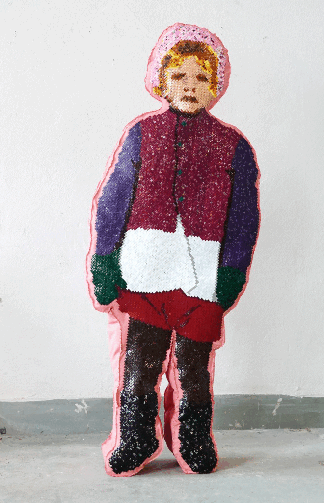Genom att skära och fläta till synes vardagliga och hemnära material skapas dagboksliknande föremål — och det som började som textil och kaffe-förpackningar blir tredimensionella porträtt och självbiografiska skulpturer. Resultatet är en värld av minnesbilder, där pixlat upplösta objekt berättar historier om barndom, familj, föräldraskap, relationer, sårbarhet, identitet och arv.